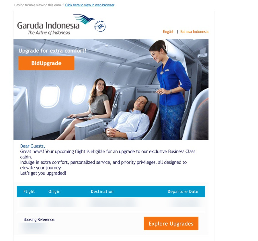 가루다항공은 출발 약 일주일 전, 이코노미 승객에게 비즈니스 업그레이드 기회를 제공하는 메일을 발송합니다.